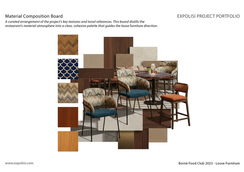Bornè Food Club by Expolisi blends industrial architecture with biophilic design in an airy conservatory setting. A sophisticated mix of wood, rattan, and marble balances cool ceramics with warm earth tones, creating a timeless atmosphere defined by custom furniture.